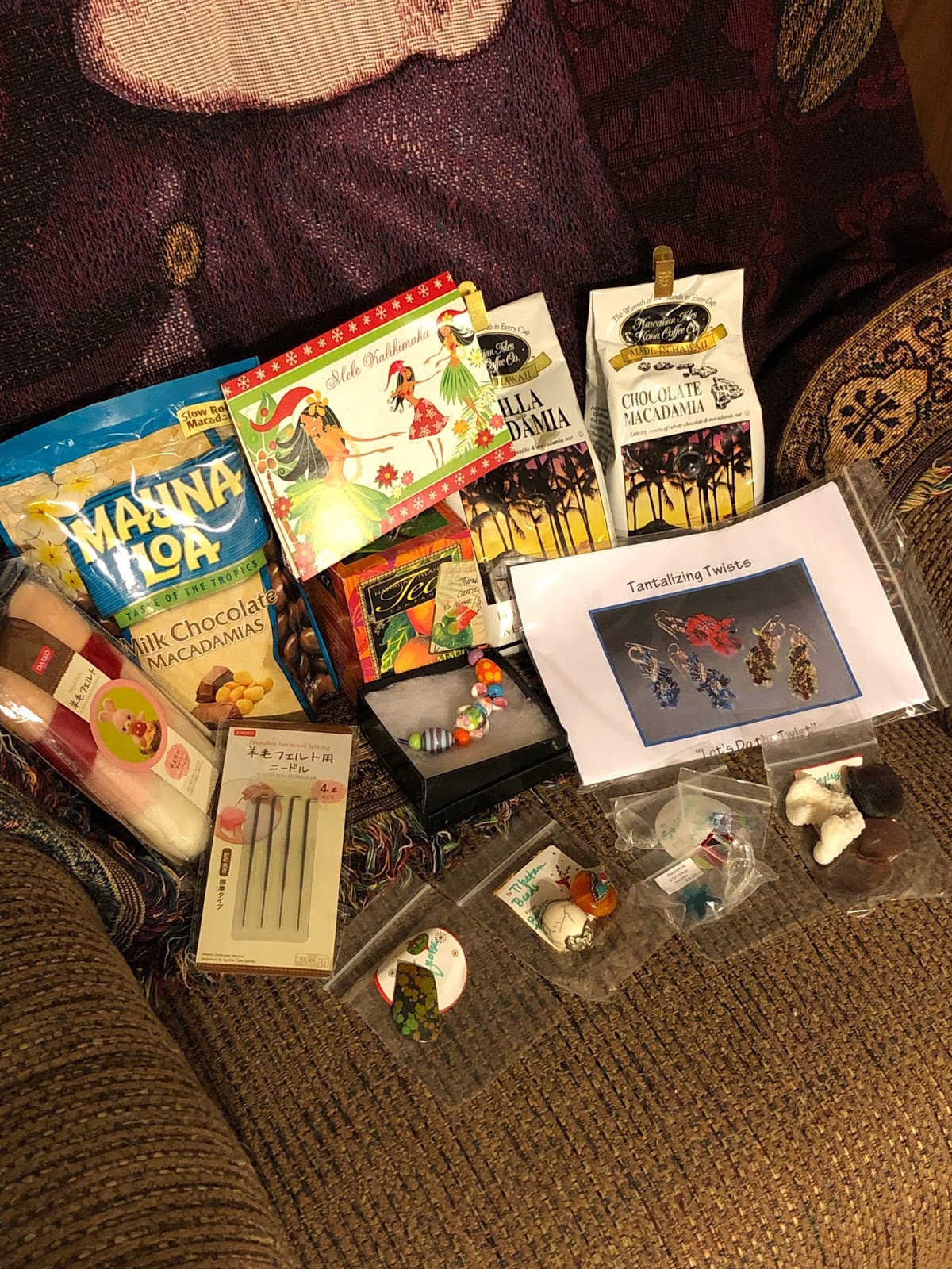 And, then, I received this big package in the mail. I couldn’t wait to open it. But I shipped mine late and I wanted to wait until Therese had hers. I was hoping that it would be worth the wait for her! It was definitely worth the wait for me. On my goodness, wow! I’m speechless. She made me a bead embroidered lizard (my favorite) in all my favorite colors – it couldn’t have been more perfect. It is my absolute favorite lizard and she made my day, week and month! So, Mahalo, Therese for such a wonderful ornament, I will treasure it for all the years to come. Here’s a peak at all the goodies that arrived in the package. Therese also hand painted the star box and star ornament, again in my favorite colors. The jellyfish paperweight is just stunning and the soy candle will be put to good use. And then, to top it off she included several of the stone cabochons that she made. Thank you for being such a wonderful and generous swap