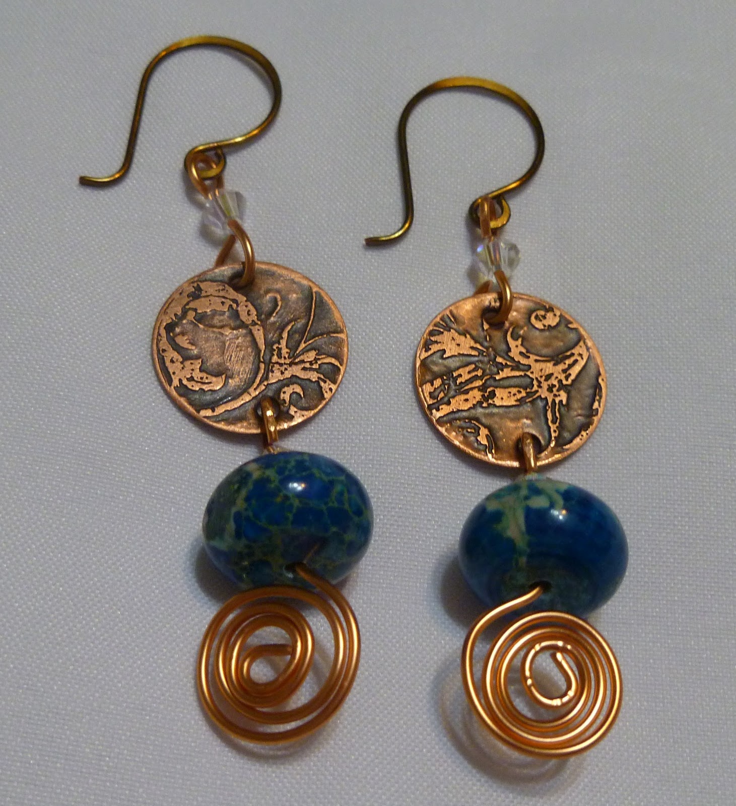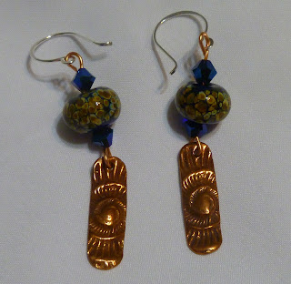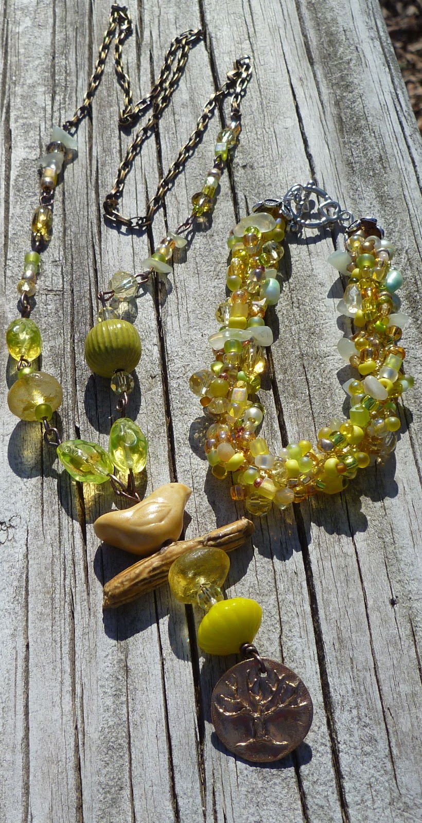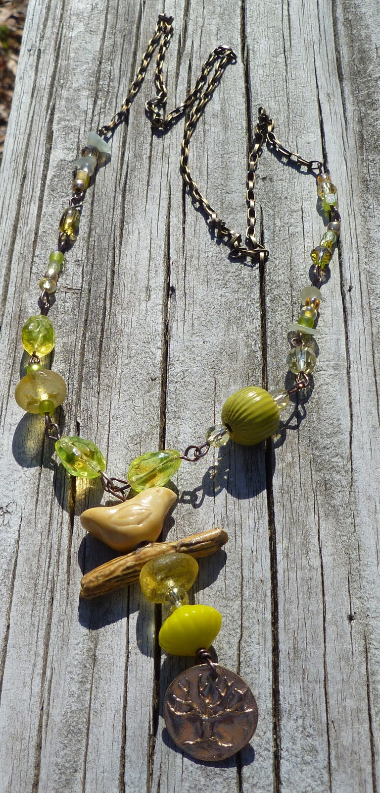 I hung the bronze charm on some bronze colored aluminum wire and then strung the yellow fluted glass bead, a jonquil round crystal, a jonquil glass roundel, the ceramic branch, and the clay bird to finish out the pendant. I then made a chain with the rest of the larger beads in the kit with some of the bead soup mix and connected it all to the brass chain making it long enough to just slip over one's head without having a clasp.