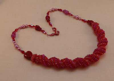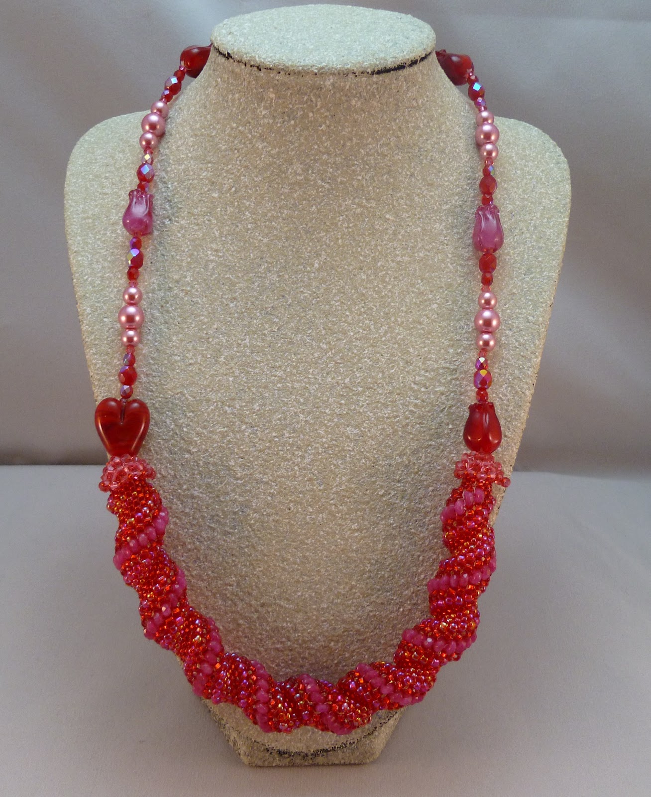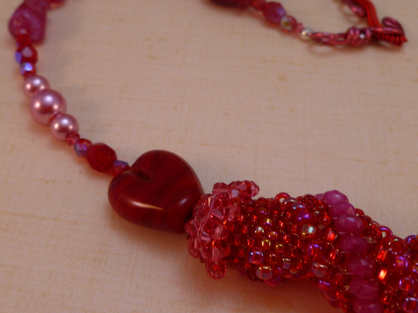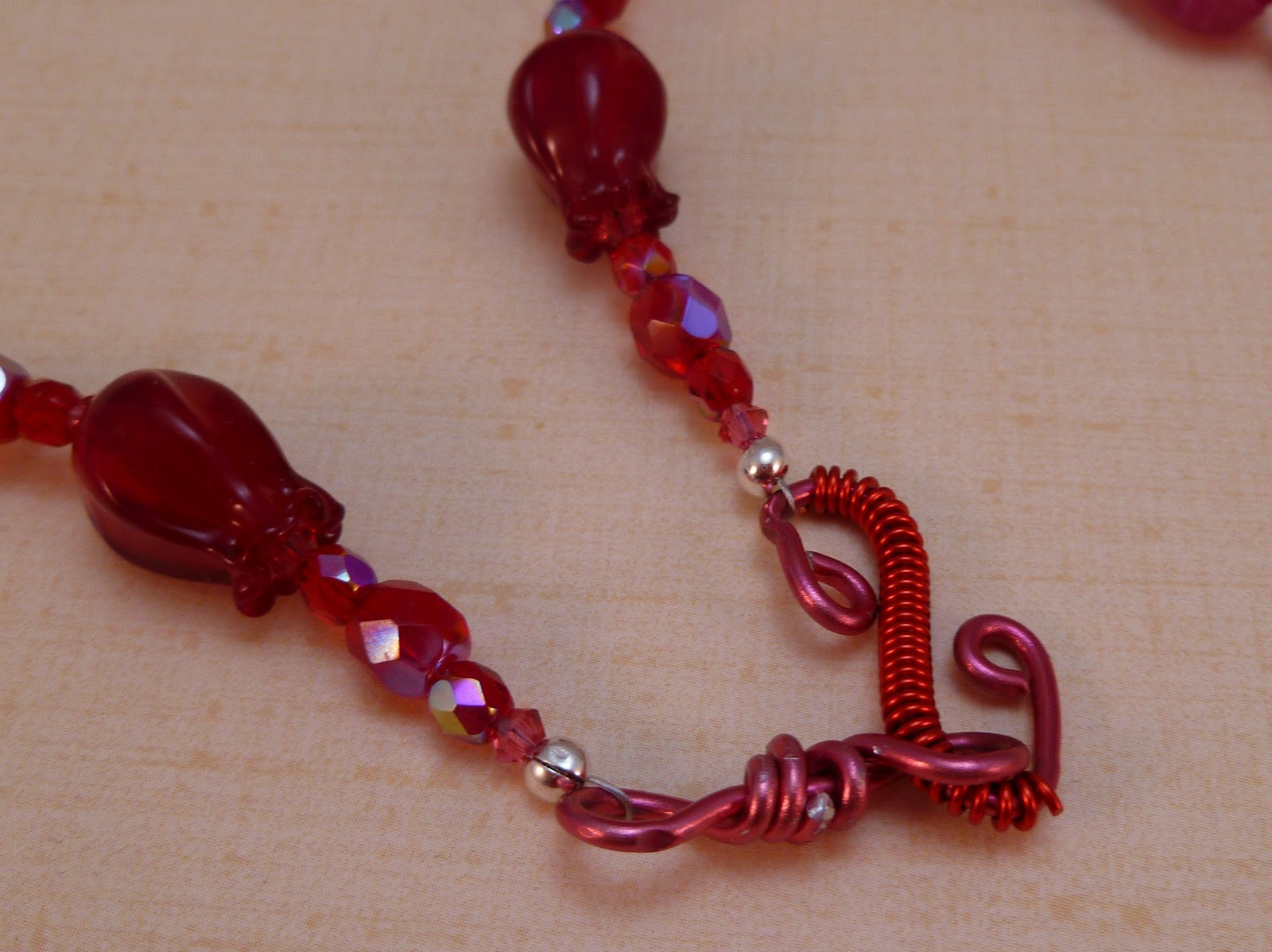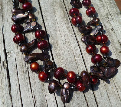 Stephanie is not a very flashy character she mainly wears tank tops, t-shirts, and jeans. This necklace is light weight and will go with just about any thing. It would look good on Stephanie whether she was dressing down or up. Stephanie is a natural type of female, but not your average type of female that is why I chose to use potato and dagger fresh water pearls in red and bronze. Between the pearls are gunmetal color metal 4mm beads and gold colored 3mm bi-cone beads. I connected the two strands of pearls to a gun metal colored chain, then I added a silver tone heart shaped toggle clasp.