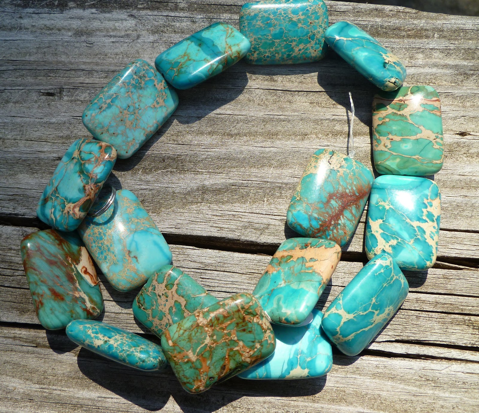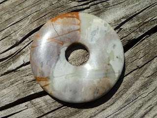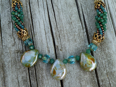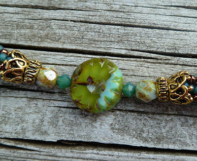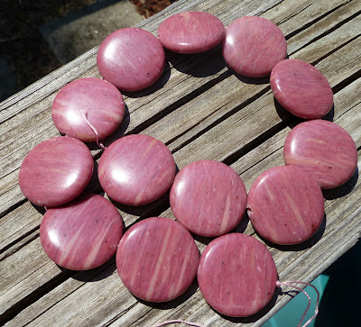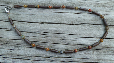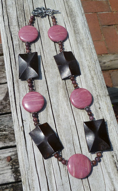 Connie is Cousin Vinnie's out spoken secretary. Connie is your typical Jersey Girl that likes to dress in Jersey Girl fashion. I created this necklace with Connie in mind. This necklace is just enough to make a statement and not be all in your face. I used 22mm round pink stone beads and paired them with fancy cut rectangle wood beads, between the big beads are 6mm round brown shell beads. and silver tone spacers. I used a grape leaf shaped toggle.