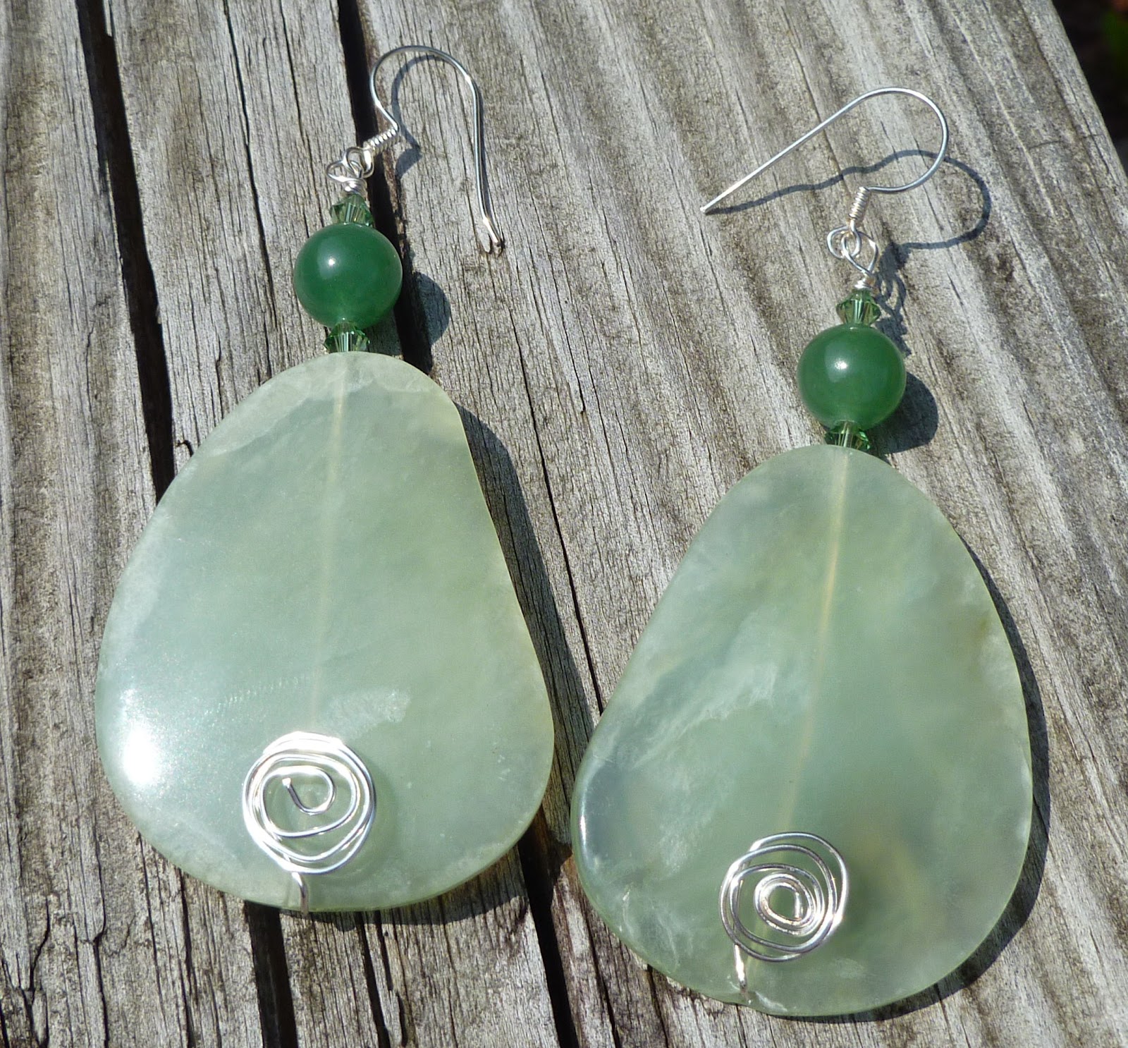 I did not have headpins long enough for these large beads so I took some 22 gauge silver tone wire and made a spiral on one end and the 4mm crystal bi-cones and 12mm Aventurine beads then wire wrapped the earring wires onto the earrings. They are heavy, but that would not matter to Lula as long as they looked good.