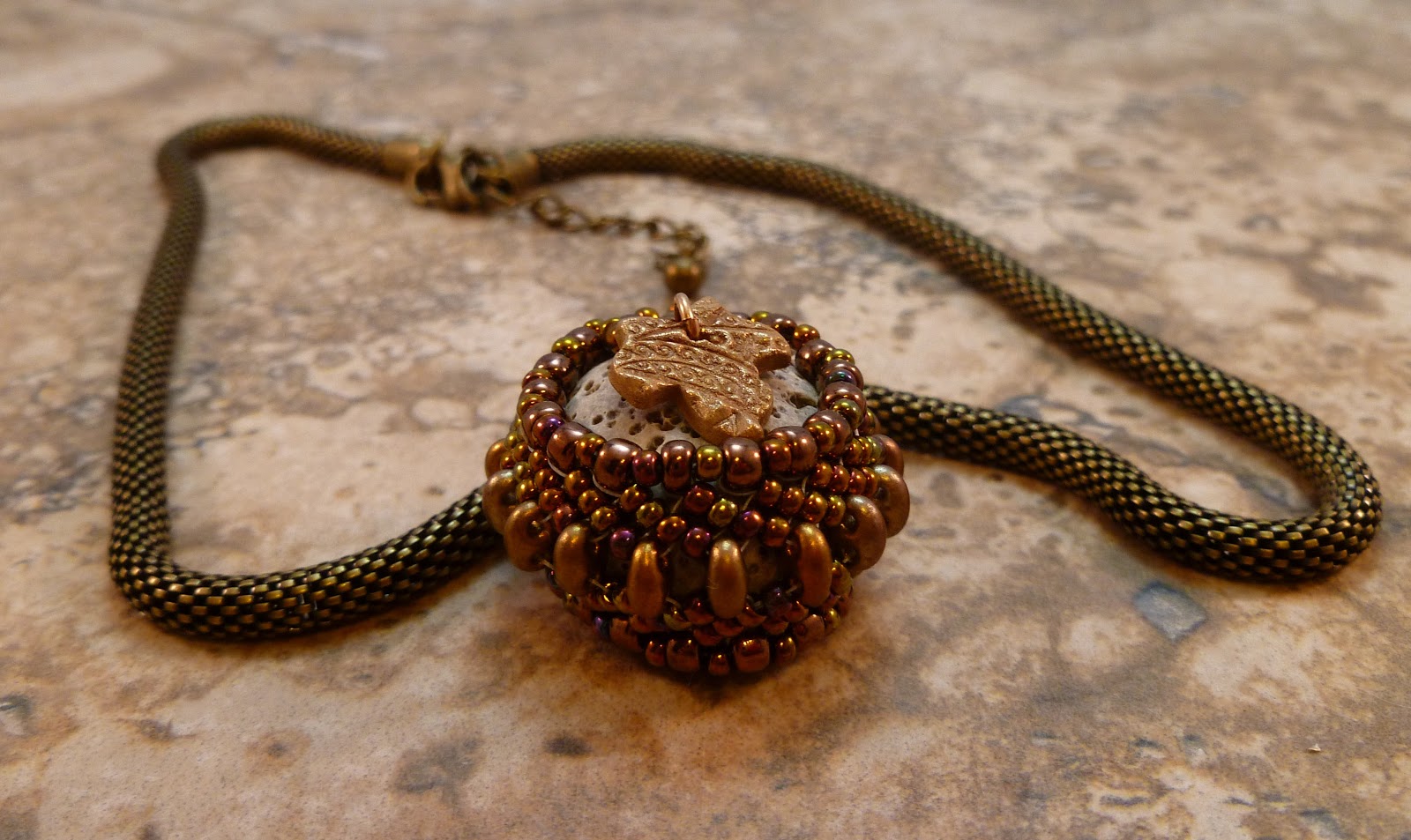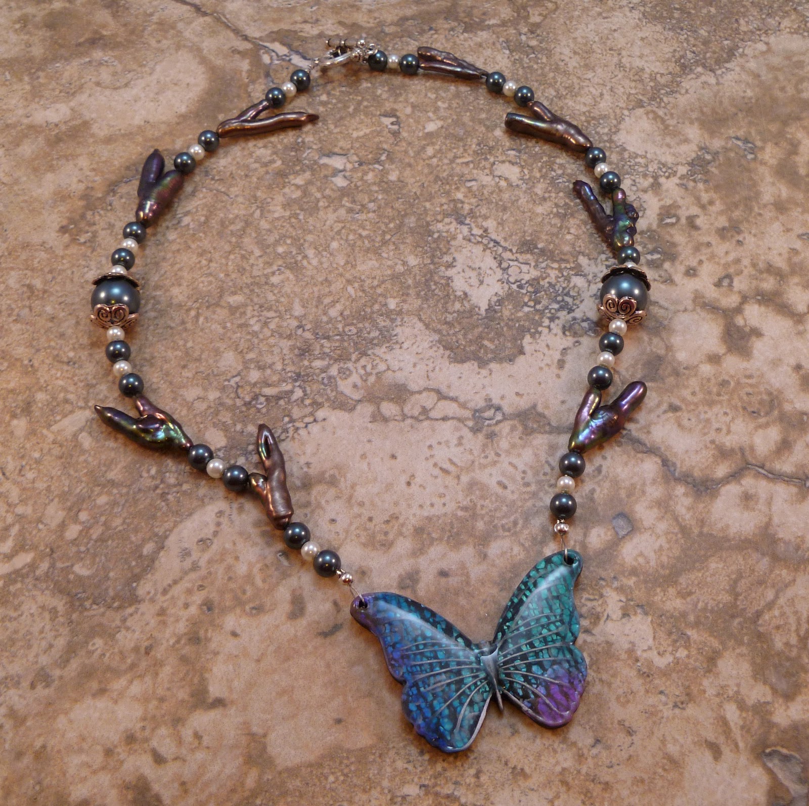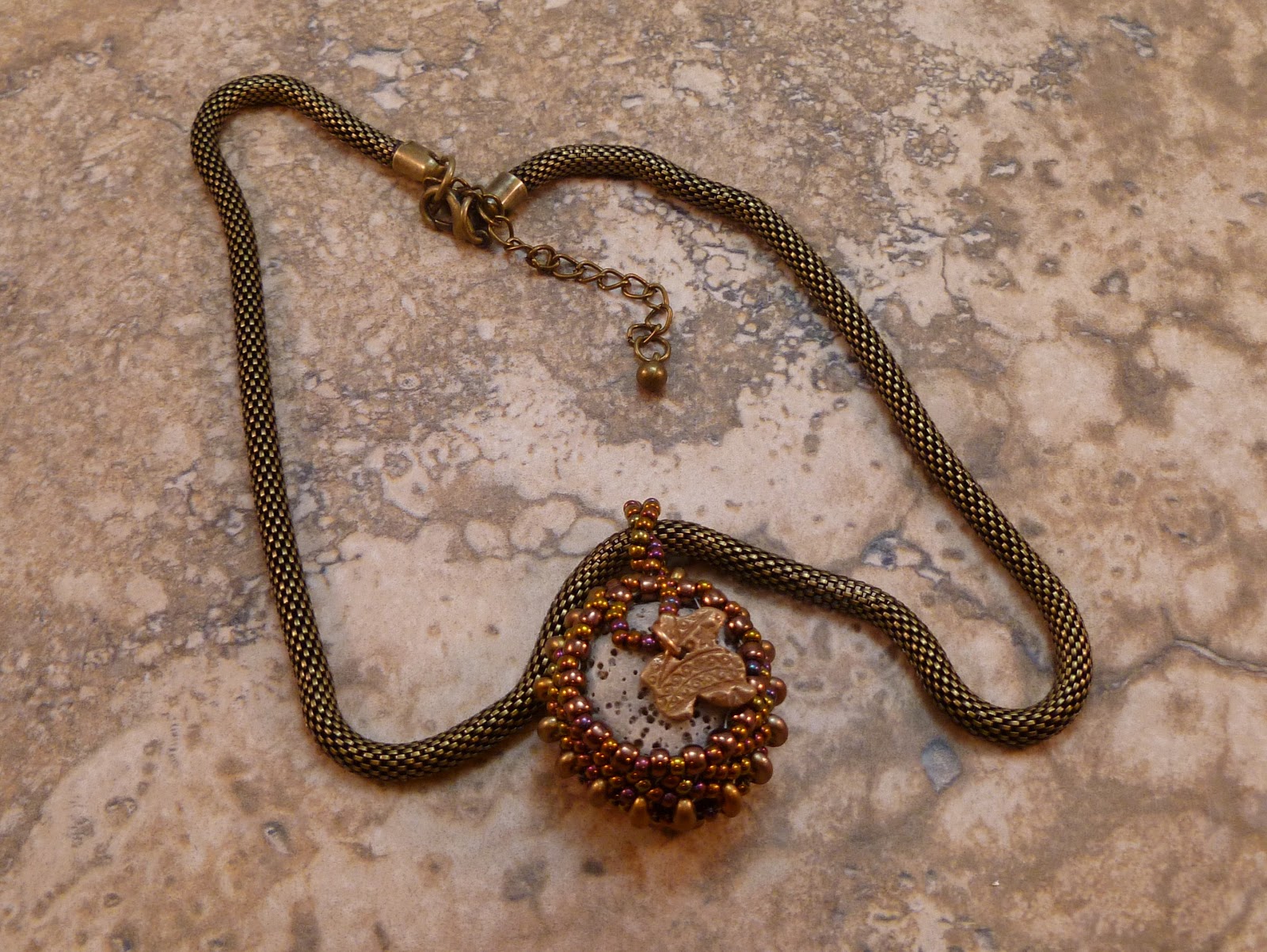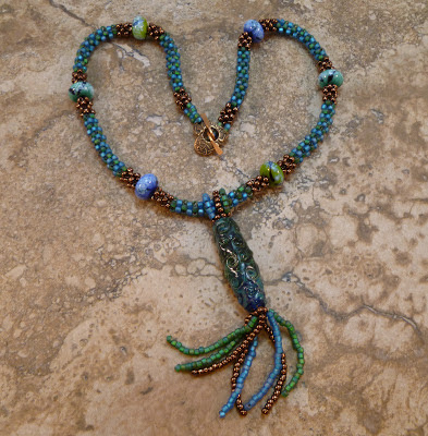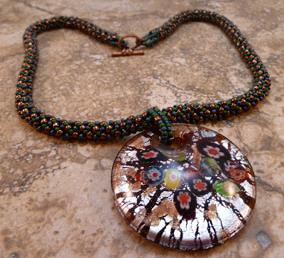 This is also a Monomint tutorial Tricia's pendant. This photo does not do the colors in this pendant justice the blue in the rivoli is gorgeous deep blue, and the glass pearls around the edge of the rivoli are a pale green.