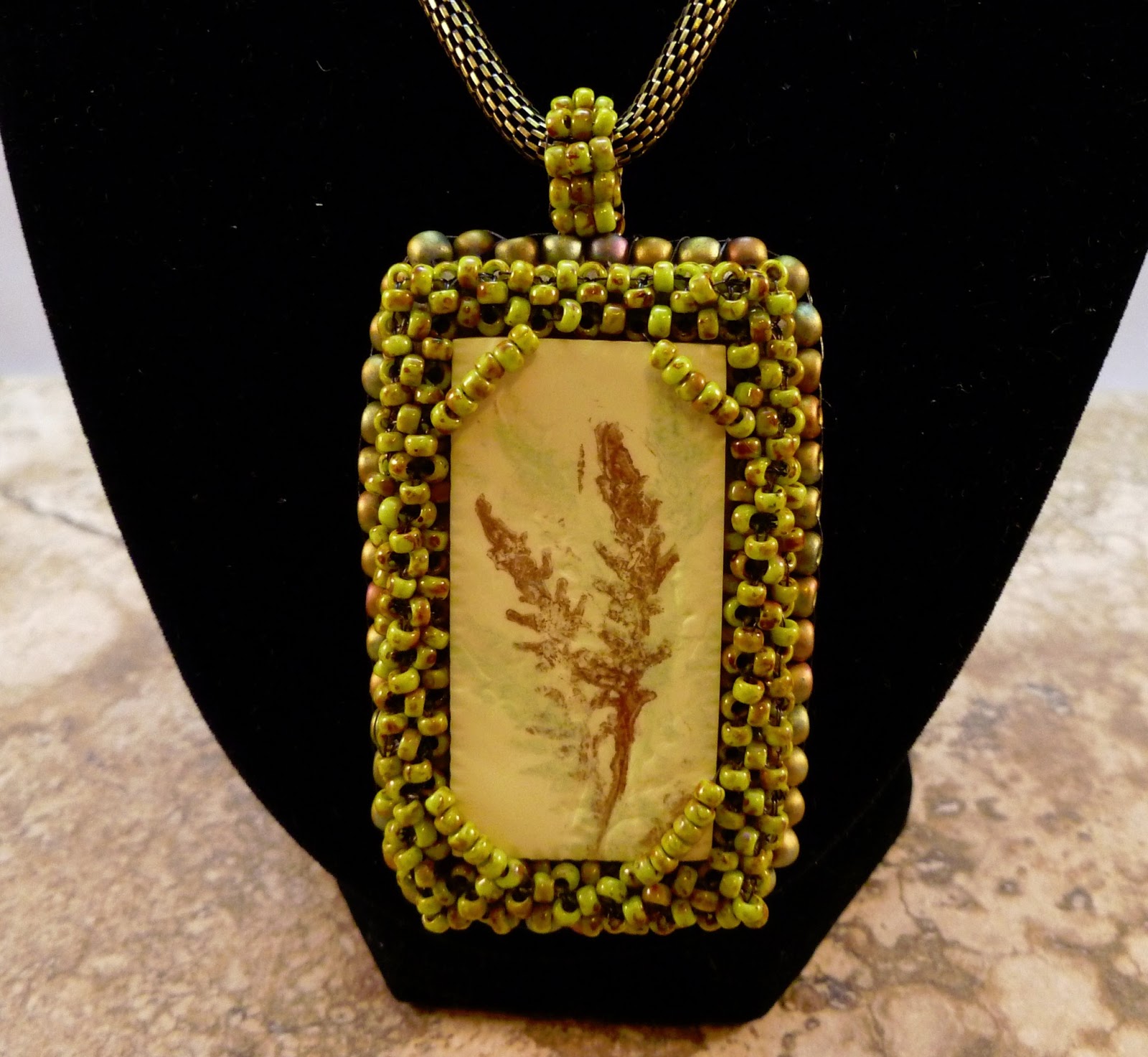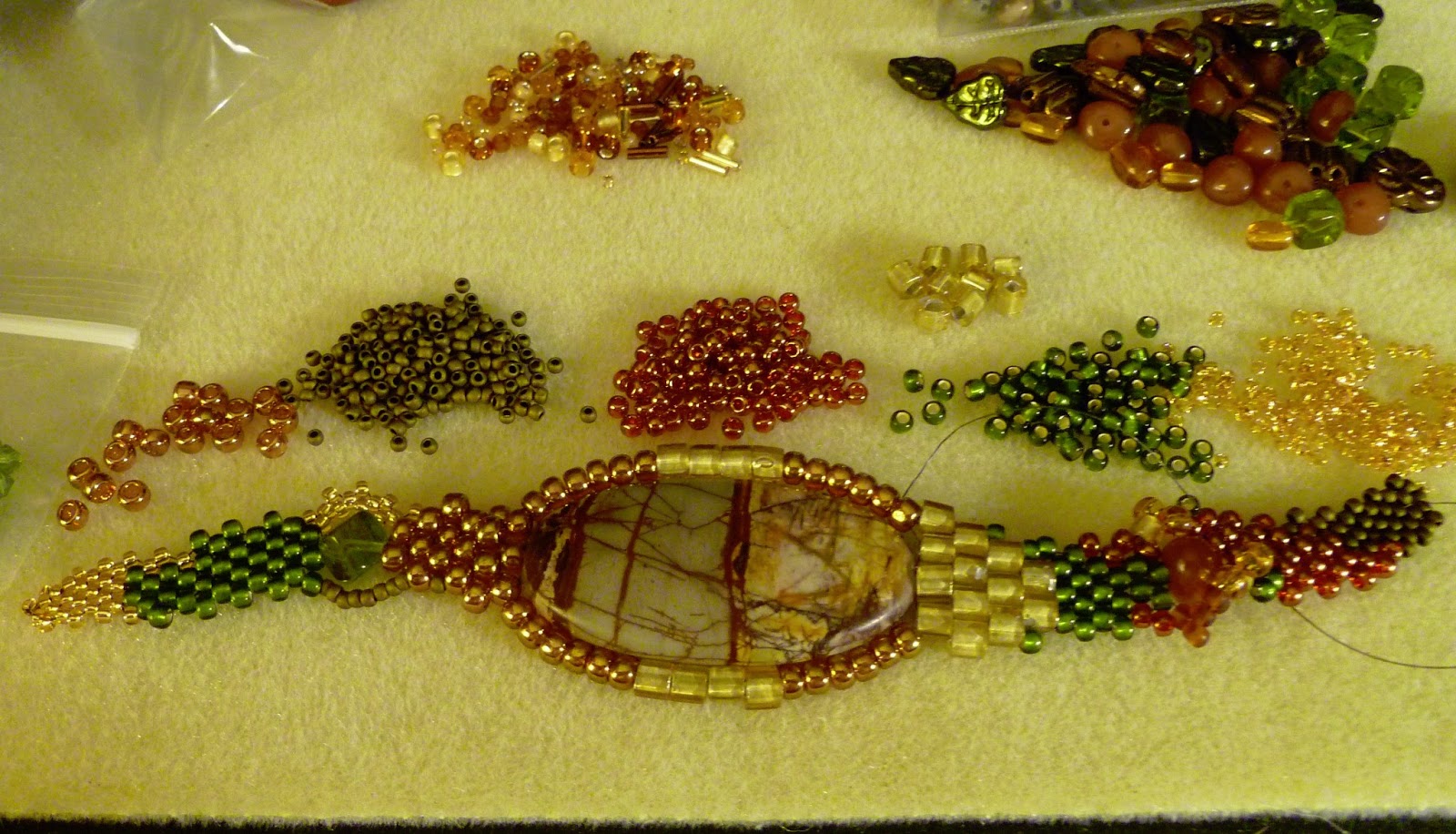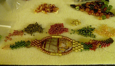 I love the glass heart, but it was not an easy item to make a design with, but as luck would have it a friend of mine gave me the perfect pink size 11 seed beads to go with this heart and I was able to pull a blue, green, and golden tan that matches perfectly to the golden tan in the heart, out of my stash of ever growing seed beads. So what stitch do you think I went for with four different colors of seed beads? Well my old favorite Twisted Herringbone of course.