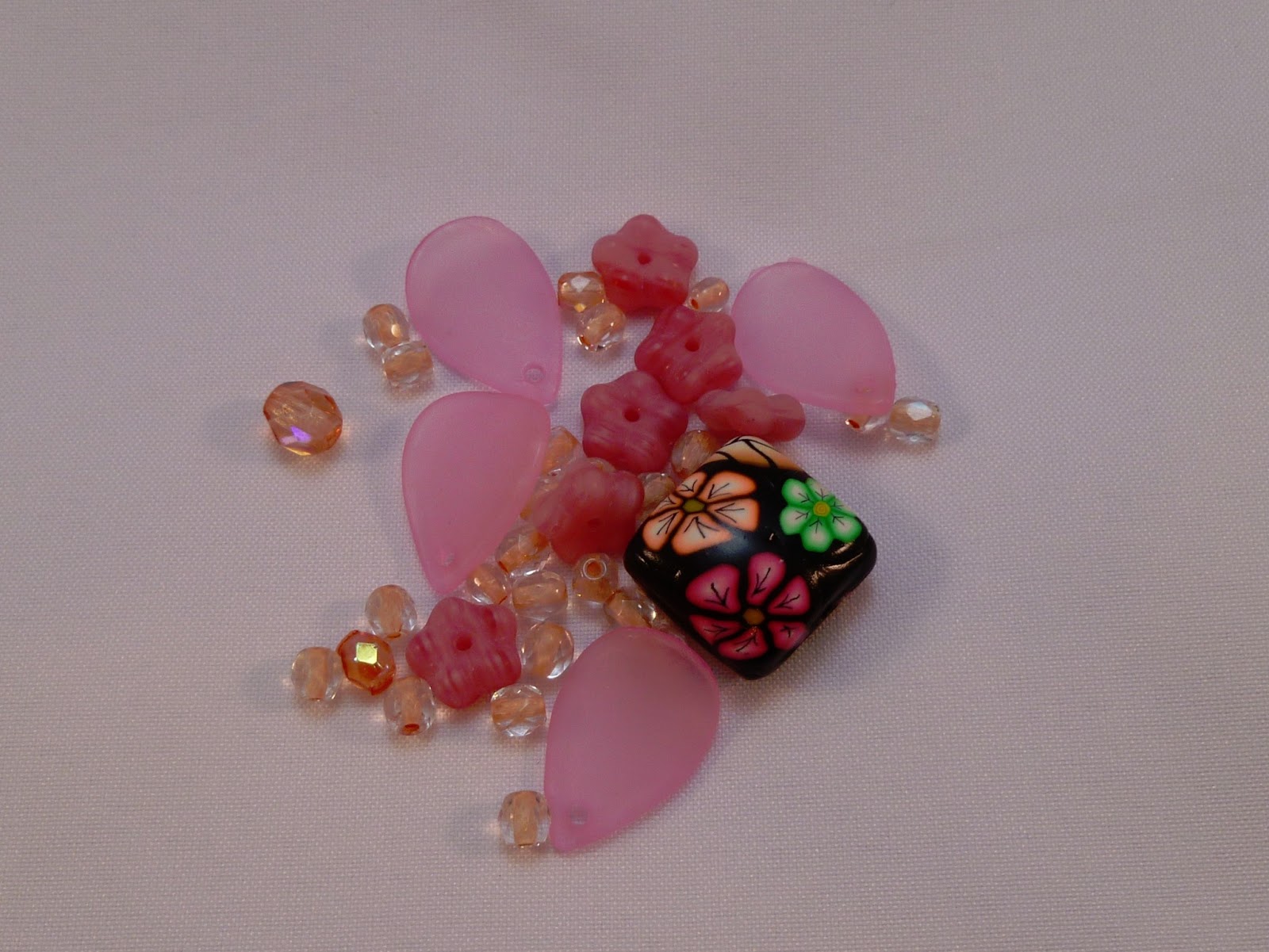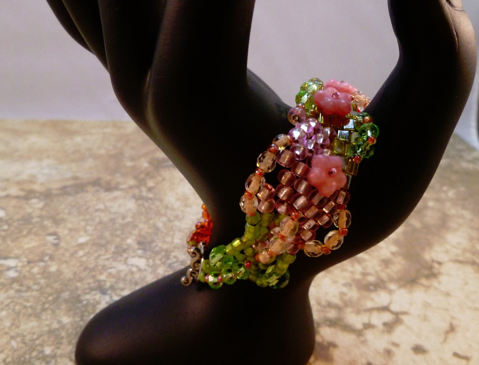 You can not tell in the photo, but the clasp is a heart shaped toggle. I had two glass beads also made by Juli Cannon, that sort of matched the heart, so I added them for a little contrast. I used Czech glass pressed pink flower beads for the spacers between the glass beads and heart.